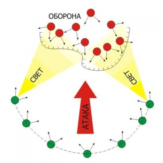 7. При подходе к объекту нападения стоит перестроиться в боевой порядок. Положительно себя зарекомендовал маневр "подкова", которой обхватывается объект атаки, при этом крайние фланговые с мощными фонарями по команде подсвечивают местность, предварительно спрятавшись за укрытием, а остальные ведут плотный огонь. Затем смена позиций и все сначала.